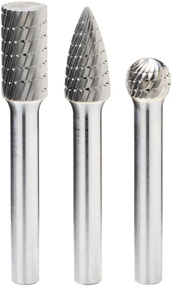 Sada 3 ks tvrdokovových frézovacích kolíků s dříky o průměru 6 mm s frézami různého tvaru.