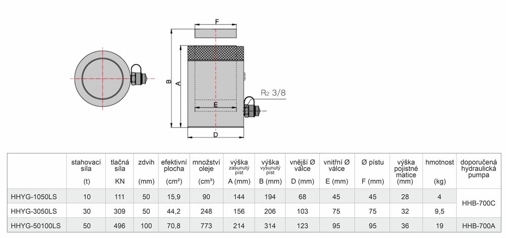 | nosnost zdvih výška se zasunutým pístem (A) výška ve vysunutém stavu (B) efektivní plocha válce maximální pracovní tlak objem oleje vnější průměr (D) vnitřní průměr (E) průměr pístu (F) výška pojistné matice hmotnost doporučená hydraulická pumpa |
