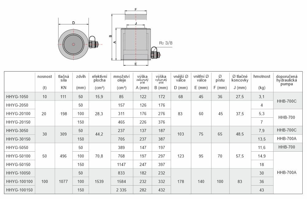 | nosnost zdvih výška se zasunutým pístem (A) výška ve vysunutém stavu (B) efektivní plocha válce maximální pracovní tlak objem oleje vnější průměr válce (D) vnitřní průměr válce (E) průměr pístu (F) průměr tlačné koncovky (J) hmotnost doporučená hydraulická pumpa |